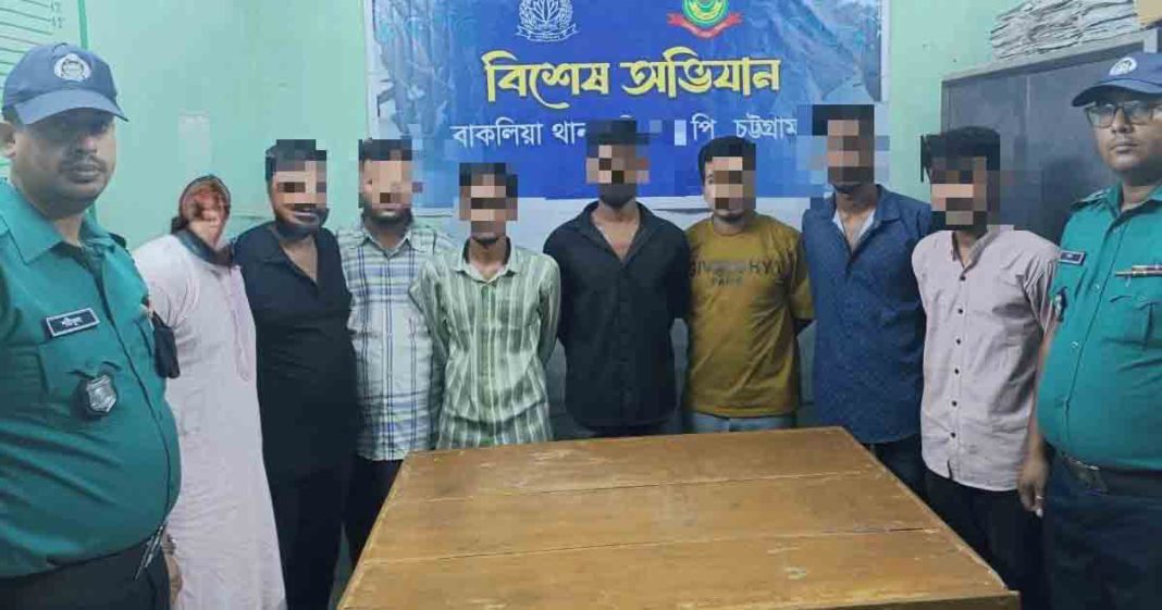 গ্রেপ্তাররা হলেন— সবুজ ইসলাম মিরাজ (২৪), মো. সাইদুল ইসলাম (২০), এমরান হোসেন সাগর (৩০), জিহান (২২), মো. তামজিদুল ইসলাম প্রিন্স ওরফে সাজু (৪৭), মো. আরাফাত (২২), মো. ওসমান (২৮) ও দিদারুল আলম রাসেল (৪০)।