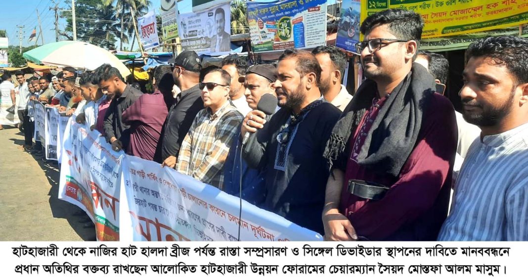 খবর বিজ্ঞপ্তি: আলোকিত হাটহাজারী উন্নয়ন ফোরামের চেয়ারম্যান সৈয়দ মোস্তফা আলম মাসুম বলেছেন চট্টগ্রাম জেলার চট্টগ্রাম-খাগড়াছড়ি একটি গুরুত্বপূর্ণ সড়ক। এ সড়কের সবচেয়ে গুরুত্বপূর্ণ এবং ব্যস্ততম এলাকা হচ্ছে হাটহাজারী-নাজির হাট সড়ক। এ সড়কে গত ১ মাসে ২০ জনের উপর প্রাণহানী এবং ১০০ জনের উপর আহত হয়েছে। এ সড়কের মূল সমস্যা ৪ লাইনের স্থলে বিগত সরকার আড়াই লাইন করে কাজ সমাপ্ত করে বরাদ্দের বাকী টাকা লুটপাট করে। এ সড়ককে মরণ ফাঁদ সড়কে রূপান্তরিত করেছে। যার ফলে এলাকাবাসী ২০১৯ সাল থেকে ভোগ করে আসছে। এ সড়কে বহু প্রাণ ঝড়েছে এবং এখনও মৃত্যু সাথে পাঞ্জা লড়ছে। তাই অন্তবর্তীকালীন সরকার, সড়ক ও জনপথ বিভাগ এবং হাটহাজারী প্রশাসনের কাছে “হাটহাজারী থেকে নাজির হাট হালদা ব্রীজ পর্যন্ত” রাস্তা সম্প্রসারণ ও সিঙ্গেল ডিভাইডার স্থাপন সহ প্রয়োজনীয় এলাকায় স্পীড বেকার বসানো জন্য বিনীত আহ্বান জানান। তিনি গতকাল উত্তর হাটহাজারী ঐতিহ্যবাহী সরকারহাট বাজারে সর্বস্তরের জনসাধারণ, সামাজিক সামাজিক সংগঠন, মানবিক সংগঠন এবং ধর্মীয় সংগঠনের সমন্বয়ে হাটহাজারী থেকে নাজির হাট হালদা ব্রীজ পর্যন্ত রাস্তা সম্প্রসারণ ও সিঙ্গেল ডিভাইডার স্থাপনের দাবিতে মানববন্ধনে প্রধান অতিথির বক্তব্য রাখতে গিয়ে এ কথা বলেন। মানববন্ধনে অন্যান্যদের মধ্যে উপস্থিত ছিলেন চট্টগ্রাম উত্তর জেলা কৃষক দলের সিনিয়র যুগ্ম আহ্বায়ক লায়ন আনোয়ার হোসেন উজ্জ্বল, বিএনপি নেতা মুহাম্মদ সেলিম উদ্দিন চৌধুরী, মির্জাপুর উচ্চ বিদ্যালয়ের শিক্ষক সৈয়দ মুহাম্মদ সাব্বির, মির্জাপুর অনির্বাণ ক্লাবের সভাপতি এস.এম. মাহফুজুল আলম, বিএনপি নেতা হাজী আবুল বশর, মুহাম্মদ নুরুল ইসলাম, মুহাম্মদ জসিম উদ্দিন, যুবদল নেতা মুহাম্মদ বাবলু, হাটহাজারী উপজেলা স্বেচ্ছাসেবক দলের সদস্য মুহাম্মদ ফয়সালসহ মির্জাপুর প্রবাসী কল্যাণ পরিষদের সদস্য বৃন্দ, মিজাপূর মানবিক অক্সিজেন’র কর্মকর্তাবৃন্দ আলোকিত হাটহাজারী উন্নয়ন ফোরাম মির্জাপুর শাখার নেতৃবৃন্দ, মির্জাপুরের সম্মিলিত মুসল্লি পরিষদের নেতৃবৃন্দ এবং সরকার হাট, বাকর আলী চৌধুরী হাট, কালী দাশ চৌধুরী হাট এবং মহুরী হাট ব্যবসায়ী সংগঠনের নেতৃবৃন্দ উপস্থিত ছিলেন। মানববন্ধনে বক্তাগণ উল্লেখ করেন অনতিবিলম্বে হাটহাজারী থেকে নাজির হাটপর্যন্ত সড়কে সিঙ্গেল ডিভাইডার নির্মাণসহ রাস্তা সম্প্রসারণের দাবি জানান।