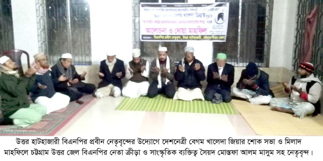 প্রবীন বিএনপি নেতা সাবেক স্বাস্থ্য কর্মকর্তা মুহাম্মদ ওবাইদুল আকবর’র সভাপতিত্বে অন্যান্যদের মধ্যে বক্তব্য রাখেন মাওলানা মুহাম্মদ শামসুল আলম, প্রবীন বিএনপি নেতা সুলতানুল আলম চৌধুরী, চট্টগ্রাম বিশ্ববিদ্যালয়ের সাবেক কর্মকর্তা হাজী মুহাম্মদ রবিউল ইসলাম, বিএনপি নেতা হাজী মুহাম্মদ আবুল বশর, প্রবীন বিএনপি নেতা মুহাম্মদ জসিম উদ্দিন, বিএনপি নেতা মুহাম্মদ নজরুল ইসলাম দুলাল, হাটহাজারী উপজেলা ওলামা দলের সভাপতি গাজী মুহাম্মদ আজিজ উদ্দিন, মুহাম্মদ সেকান্দর, মুহাম্মদ ওসমান, মুহাম্মদ রফিকুল আলম, প্রমুখ নেতৃবৃন্দ। বিএনপির চেয়ারপার্সন দেশনেত্রী বেগম খালেদা জিয়ার মৃত্যুতে দোয়া, মিলাদ মাহফিল ও বিশেষ মুনাজাতে তার আত্মার মাগফেরাত কামনা করা হয় এবং দেশের স্বাধীনতা, সার্বভৌমত্ব, গণতন্ত্র, বাকস্বাধীনতা রক্ষায় ও দেশের সামগ্রিক শান্তি কামনা করা হয়।