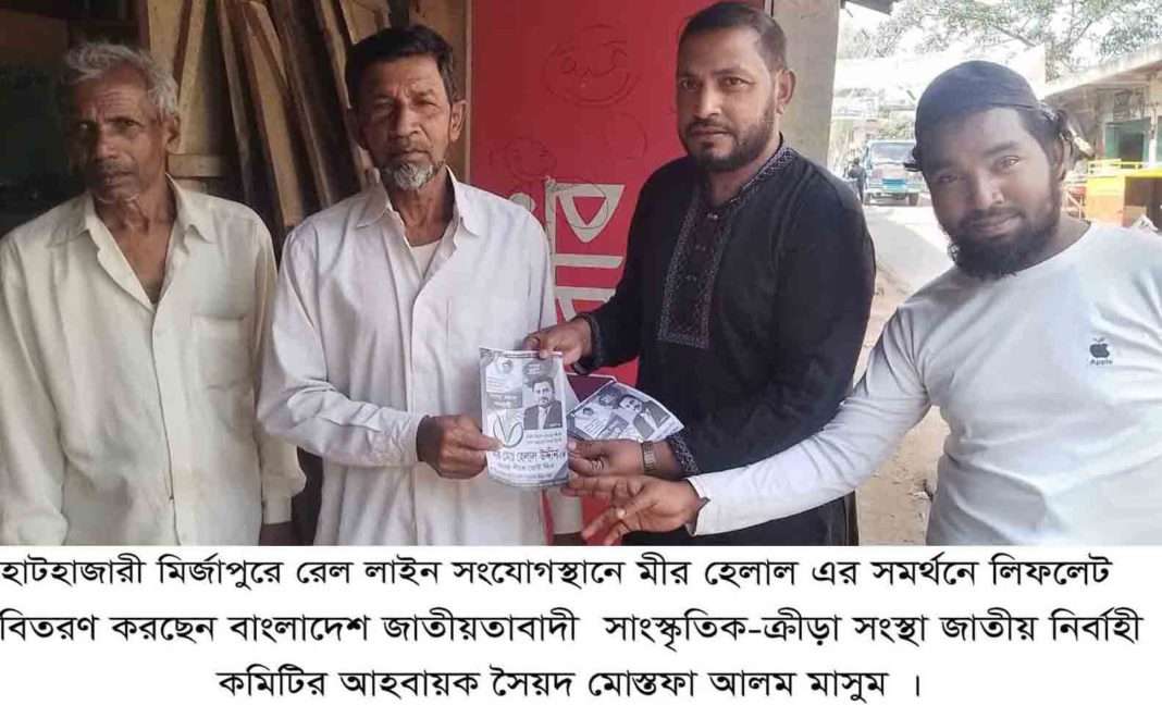আজ সকালে হাটহাজারী মির্জাপুরে বিভিন্ন এলাকায় মীর হেলাল এর সমর্থনে লিফলেট বিতরণ কালে জনগণের মাঝে ধানের শীষ প্রতিকে ভোট প্রধানের আহবান জানাতে গিয়ে একথা বলেন। এই সময় বিএনপি নেতার মধ্যে উপস্থিত ছিলেন মোঃ আমির আহম্মদ বাচা, ফরিদ আহম্মদ, শাহাব মিয়া, মোঃ রফিকুল আলম, মোঃ ছরওয়ার, যুবদল নেতা মোঃ ফারুক, মোঃ হোসেন প্রমূখ।