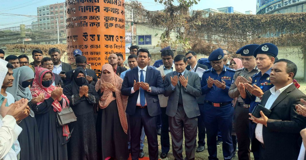 নিজস্ব প্রতিবেদক: চট্টগ্রাম নগরীর নিউ মার্কেট এলাকার ট্রাফিক পুলিশ বক্স সংলগ্ন রেল স্টেশনের বাউন্ডারির ভিতর জুলাই স্মৃতিস্তম্ভ স্থাপন উপলক্ষে বৃহস্পতিবার সকাল সাড়ে ১১টায় শহীদ পরিবারের সদস্যদের নিয়ে দোয়া মাহফিলের আয়োজন করা হয়। চট্টগ্রাম জেলা প্রশাসক মোহাম্মদ জাহিদুল ইসলাম মিঞার সভাপতিত্বে অনুষ্ঠিত দোয়া মাহফিলে প্রধান অতিথি ছিলেন বিভাগীয় কমিশনার ড. মোঃ জিয়াউদ্দীন। বিশেষ অতিথি ছিলেন পুলিশের চট্টগ্রাম রেঞ্জ ডিআইজি মোঃ আহসান হাবীব পলাশ, সিএমপি’র অতিরিক্ত পুলিশ কমিশনার (ট্রাফিক) ওয়াহিদুল হক চৌধুরী, উপ-পুলিশ কমিশনার (দক্ষিণ) হোসাইন মোহাম্মদ কবীর ভূঁইয়া (অতিরিক্ত ডিআইজি), জেলা পুলিশ সুপার (এসপি) মোহাম্মাদ নাজির আহমেদ খাঁন ও সিএমপি’র ট্রাফিক দক্ষিণ বিভাগের উপ-পুলিশ কমিশনার মোহাম্মদ লিয়াকত আলী খান, পিএসসি। ২৪’র জুলাই অভ্যুত্থানে চট্টগ্রামে শহীদ পরিবারের সদস্যদের পাশাপাশি চট্টগ্রাম বিভাগীয় কমিশনার কার্যালয়, জেলা প্রশাসকের কার্যালয়, পুলিশ বিভাগসহ সরকারী বিভিন্ন দপ্তরের কর্মর্কতা-কর্মচারীরা দোয়া মাহফিলে অংশ নেন।