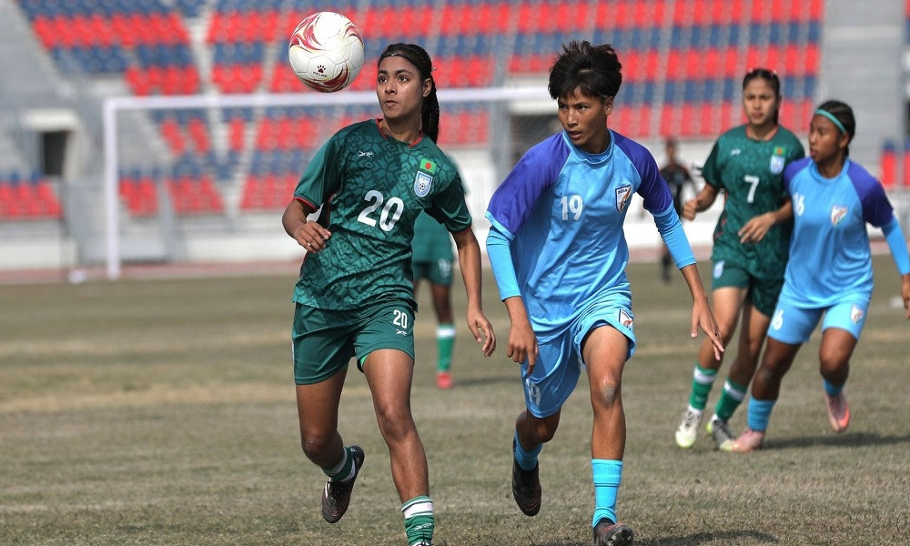 তবে ম্যাড়মেড়ে মনে হওয়া ম্যাচে প্রাণ ফেরে ৪২ মিনিটে। বাঁ দিক থেকে আসা ক্রস ক্লিয়ার করতে পারেননি এতক্ষণ রক্ষণ জমাট রাখা অর্পিতা-জয়নব-সুরভিরা। দূরের পোস্টে ফাঁকায় থাকা প্রীতিকা বর্মণ বল পেয়ে যান, কিন্তু তিনি নিজে শট না নিয়ে বাড়িয়ে দেন ঝুলান নঙ্গমাইথেমকে, সহজেই বাংলাদেশ গোলকিপার ইয়ারজানকে পরাস্ত করেন ভারত অধিনায়ক।আসরে প্রথমবারের মতো গোল খেয়ে পিছিয়ে থাকার অস্বস্তি নিয়ে বিরতিতে যায় বাংলাদেশ। বিরতি থেকে ফিরে সমতাসূচক গোলের জন্য মরিয়া হয়ে ওঠে বাংলাদেশ।৫২ মিনিটে সুবর্ণ সুযোগ পেয়েও যান তৃষ্ণা। সতীর্থের থ্রু পাস ধরে গোলকিপারকে একা পান তিনি। কিন্তু অভাবনীয়ভাবে বাইরে শট নেন। বাংলাদেশের ম্যাচে ফেরার সম্ভাবনা আরো ফিকে হয়ে যায় ৬২ মিনিটে এলিজাবেথ লাকরার সফল স্পট কিকে। আক্রমণ ক্লিয়ার করতে ইয়ারজান পোস্ট ছেড়ে বেরিয়ে গেলেও বলের নাগাল পাননি। এরপর আলভা দেবী বলের নিয়ন্ত্রণ নিতে যাওয়ার সময় প্রতিমা মুন্দার আলতো স্পর্শে বক্সে পড়ে গেলে পেনাল্টির বাঁশি বাজান রেফারি।
