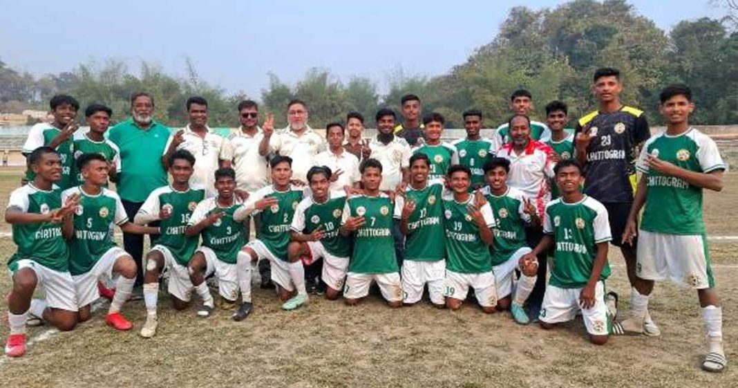 ক্রীড়া ডেস্ক: অনুর্ধ্ব-১৭ জাতীয় ফুটবল চ্যাম্পিয়নশীপে শুভ সূচনা করেছে চট্টগ্রাম জেলা দল। বৃহস্পতিবার (৫ মার্চ) বান্দরবান জেলা স্টেডিয়ামে অনুষ্ঠিত কর্ণফুলী জোনের উদ্বোধনী দিনের ম্যাচে খাগড়াছড়ি জেলা দলকে ৩-০ গোলে হারিয়েছে তারা। খেলার প্রথমার্ধের ২৮ মিনিটে প্লেসিং শটে চট্টগ্রাম এগিয়ে দেয় সায়েম। দ্বিতীয়ার্ধে আরো আক্রমণাত্মক হয়ে ওঠে চট্টগ্রাম। এই অর্ধ্বের ৩০ মিনিটে অধিনায়ক সাবিদ খানকে দিয়ে দ্বিতীয় গোল নিশ্চিত করে। এরপর ৩৫ মিনিটে আবদুল করিম শেষ পেরেক টুকে দিলে ব্যবধান হয় ৩-০। শেষ পর্যন্ত এই ব্যবধানেই জয় নিশ্চিত করে চট্টগ্রাম জেলা দল।ম্যাচের সেরা খেলোয়াড় নির্বাচিত হন সাবিদ খান নিরব। তার হাতে পুরস্কার তুলে দেন সিডিএফএ যুগ্ম সম্পাদক সালাউদ্দিন জাহেদ ও বিএফএ কর্মকর্তারা।এর আগে দিনের প্রথম ম্যাচে স্বাগতিক বান্দরবান জেলা দল রাঙ্গামাটিকে ২-০ গোলে হারায়।উদ্বোধনী অনুষ্ঠানে প্রধান অতিথি হিসেবে উপস্থিত ছিলেন বান্দরবান জেলা প্রশাসক শামীম আরা রিনি। বান্দরবান জেলা ফুটবল এসোসিয়েশনের আহ্বায়ক জাবেদ রেজার পরিচালনায় এবং মাহাফুজুর রশিদ বাচ্চুর সঞ্চালনায় এসময় উপস্থিত ছিলেন সিডিএফএ যুগ্ম সম্পাদক সালাউদ্দিন জাহেদ, বান্দরবান জেলা ক্রীড়া অফিসার মোহাম্মদ রেজাউল করিম, খাগড়াছড়ি জেলা ক্রীড়া অফিসার হারুনুর রশীদ কাজল, বান্দরবান প্রেস ক্লাব সভাপতি আমিনুল ইসলাম বাচ্চু, বিএফএ সম্পাদক রফিকুল আলম, সদস্য নাসির উদ্দিন ও জসিম উদ্দিন তুষারসহ ক্রীড়া সংশ্লিষ্ট অন্যান্যরা।