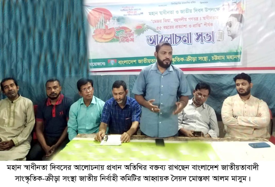 খবর বিজ্ঞপ্তি: বিএনপি নেতা ও বাংলাদেশ জাতীয়তাবাদী সাংস্কৃতিক-ক্রীড়া সংস্থা জাতীয় নির্বাহী কমিটির আহ্বায়ক সৈয়দ মোস্তফা আলম মাসুম বলেছেন, ১৯৭১ সালের মহান স্বাধীনতার ঘোষণা দিয়ে মেজর জিয়াউর রহমান বাংলাদেশের প্রান্তিক জনগোষ্ঠীকে হানাদার বাহিনীর বিরুদ্ধে যুদ্ধ করার জন্য সাহস যুগিয়েছিল। যার ফলশ্রুতিতে বাংলাদেশ একটি স্বাধীন দেশে পরিণত হয়েছিল। মেজর জিয়ার নেতৃত্বে দিশেহারা জাতিকে যে সাহস যুগিয়েছিল তার ধারাবাহিকতায় বাংলাদেশের বহুদলীয় গণতন্ত্র প্রতিষ্ঠাতেও তার ভূমিকা অত্যন্ত গুরুত্বপূর্ণ। ১৯৭৫ সালের পরে বাংলাদেশকে এক দলীয় শাসন ব্যবস্থা থেকে বের করে সকল দলকে রাজনীতি করার সুযোগ সৃষ্টি করে ছিলেন তৎকালীন জনপ্রিয় রাষ্ট্র নায়ক জিয়াউর রহমান। তার ধারাবাহিকতায় বাংলাদেশ যতবারই ষড়যন্ত্রের কবলে পড়েছিল ততবারই শহীদ জিয়ার প্রতিষ্ঠিত রাজনৈতিক দল বিএনপি দেশের কল্যাণে হাল ধরেছে। শহীদ জিয়ার শাহাদাত বরণের পর দেশনেত্রী বেগম খালেদা জিয়ার নেতৃত্বে স্বৈরাচার বিরোধী আন্দোলন এবং আধুনিক বাংলাদেশ বিনির্মাণে জনগণের কল্যাণে তারেক রহমানের নেতৃত্বে বিএনপি কাজ করে যাচ্ছে। তাই মেজর জিয়ার নেতৃত্বে বাংলাদেশের স্বাধীনতা যুদ্ধের ঘোষণা আজ সারা বিশ্বে স্বীকৃত। আগামী দিনে বাংলাদেশকে একটি গণতান্ত্রিক, জনকল্যাণকর, বন্ধু সুলভ পররাষ্ট্র নীতি নির্ভর একটি রাষ্ট্রে পরিণত করার জন্য বিএনপির চেয়ারম্যান ও প্রধান মন্ত্রী তারেক রহমানের নেতৃত্বে বাংলাদেশের সকল দেশপ্রেমিক জনগণকে ঐক্যবদ্ধ থেকে সকল ষড়যন্ত্র মোকাবেলায় সজাগ দৃষ্টি রাখার আহ্বান জানান। তিনি আজ বিকাল ৩.৩০ ঘটিকার সময় বাংলাদেশ জাতীয়তাবাদী সাংস্কৃতিক-ক্রীড়া সংস্থা চট্টগ্রাম মহানগরী কমিটির উদ্যোগে মহান স্বাধীনতা ও জাতীয় দিবস উপলক্ষ্যে “মেজর জিয়া, বহুদলীয় গণতন্ত্রঃ স্বাধীনতার ৫৫ বছরের প্রত্যাশা ও প্রাপ্তি” শীর্ষক আলোচনা সভায় প্রধান অতিথির বক্তব্য রাখতে গিয়ে এ কথা বলেন। সংগঠনের মহানগরের আহ্বায়ক মুহাম্মদ আয়ুব খান এর সভাপতিত্বে সদস্য সচিব জিএম কামাল রানার পরিচালনায় অন্যান্যদের মধ্যে বক্তব্য রাখেন সংগঠনের মহানগরের নেতা মুহাম্মদ আব্দুর রহিম, মুহাম্মদ শাহীন, মুহাম্মদ আব্দুর জব্বার, মুহাম্মদ ফখরুদ্দীন তাজবির, মুহাম্মদ শাফায়েত চৌধুরী, মুহাম্মদ জসিম উদ্দিন, মুহাম্মদ মাহীন ইন তিশার, জিএম দাইয়ান আকমাল আযান, মুহাম্মদ সাব্বির হোসাইন, মুহাম্মদ সাইফুল ইসলাম প্রমুখ।