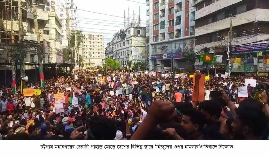 নিজস্ব প্রতিবেদক: চট্টগ্রাম মহানগরের চেরাগি পাহাড় মোড়ে অবস্থান কর্মসূচি ও বিক্ষোভ করেছেন সনাতন ধর্মাবলম্বীরা। দেশের বিভিন্ন স্থানে ‘হিন্দুদের ওপর হামলার’প্রতিবাদে শনিবার বিকেলে সড়ক অবরোধ করে নির্যাতন বন্ধের দাবিতে বিক্ষোভ করেন তারা। দাবি অনুযায়ী দেশে সংখ্যালঘু নির্যাতন বন্ধ না হলে আরও কঠোর কর্মসূচির ঘোষণার হুঁশিয়ারি দেওয়া হয়।