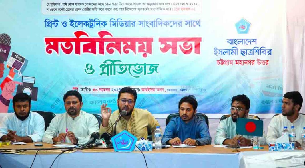 শনিবার দুপুরে নগরের চন্দনপুরা ছাত্রশিবির চট্টগ্রাম মহানগর উত্তরের অফিসে আরইসরা ভবনে প্রিন্ট ও ইলেকট্রনিক মিডিয়ার সাংবাদিকদের সঙ্গে মতবিনিময়কালে এসব কথা বলেন। এ সময় উপস্থিত ছিলেন ইসলামী ছাত্রশিবির চট্টগ্রাম মহানগর উত্তরের সেক্রেটারি তানজীর হোসেন জুয়েল, অর্থ সম্পাদক মুমিনুল হক, অফিস সম্পাদক খুররম মুরাদ, প্রকাশনা সম্পাদক আবরার হাসান রিয়াদ ও প্রচার সম্পাদক সালাউদ্দিন আকাশ প্রমুখ।