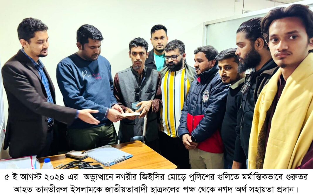 ছাত্র আন্দোলনে পুলিশের গুলিতে আহত তানভীরুলকে ছাত্রদলের নগদ অর্থ সহায়তা