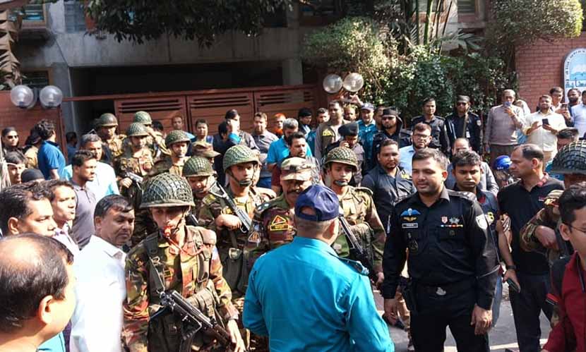 নিজস্ব প্রতিবেদক: চট্টগ্রাম মহানগরীর একটি ভবনে ঢুকে ডাকাতির চেষ্টা করার ঘটনা ঘটেছে। খবর পেয়ে ওই ভবনে অভিযান চালিয়ে দুই ডাকাতকে গ্রেফতার করেছে যৌথবাহিনী। মঙ্গলবার দুপুরে নগরীর পাঁচলাইশ থানার ও আর নিজাম রোডের একটি ভবনে এ ঘটনা ঘটে। ঘটনার পরপরই দুপুর দেড়টার দিকে পুরো ভবন ঘিরে ফেলেন পুলিশ, র্যাব ও সেনাবাহিনীর সদস্যরা। দুপুর ২টায় ঘটনাস্থলে আসেন চট্টগ্রাম মেট্টোপলিটন পুলিশের কমিশনার হাসিব আজিজ।