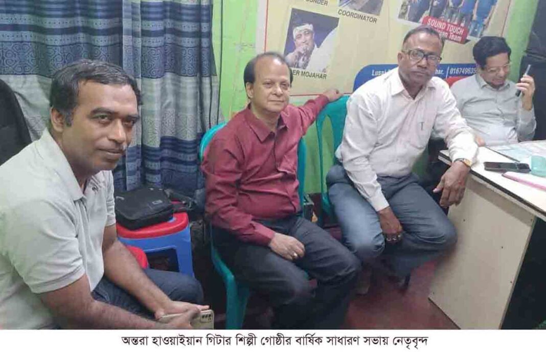 নিজস্ব প্রতিবেদক: অন্তরা হাওয়াইয়ান গিটার শিল্পী গোষ্ঠীর বর্ষপূর্তি উদযাপন উপলক্ষে বার্ষিক সাধারণ সভা মোমিন রোডস্থ লুসাই ভবনের অস্থায়ী কার্যালয়ে ২৮ ফেব্রুয়ারী রাতে অনুষ্ঠিত হয়। সভাপতিত্ব করেন সভাপতি ডা. বাবুল সেনগুপ্ত। সাধারণ সম্পাদক আশীষ কুমার বৈদ্যের পরিচালনায় উপস্থিত সদস্য/সদস্যাদের মতামতের ভিত্তিতে ৪১ তম বর্ষপূর্তি উদযাপনে নানা পদক্ষেপ নেয়া হয়। এরমধ্যে আগামী ৯ মে তারিখ ঘোষণা, মহড়া সংক্রান্ত, সংগঠনের মাসিক চাঁদা পরিশোধকরণে আলোচনা হয়।এছাড়া সভায় বর্ষপূর্তি উদযাপনে ইলিয়াস ইলুকে আহ্বায়ক করে ১৫ জন সদস্য বিশিষ্ট কমিটি গঠন করা হয়।